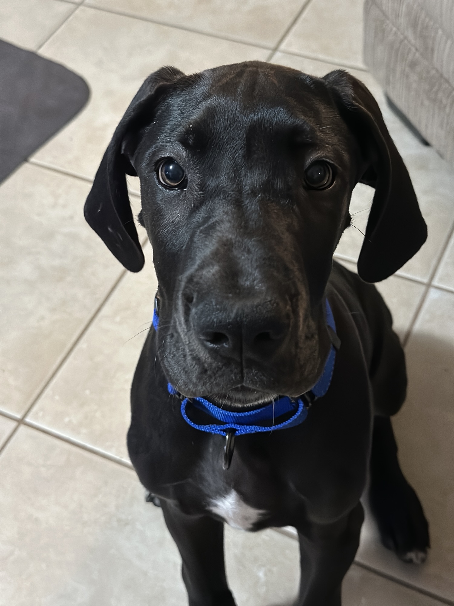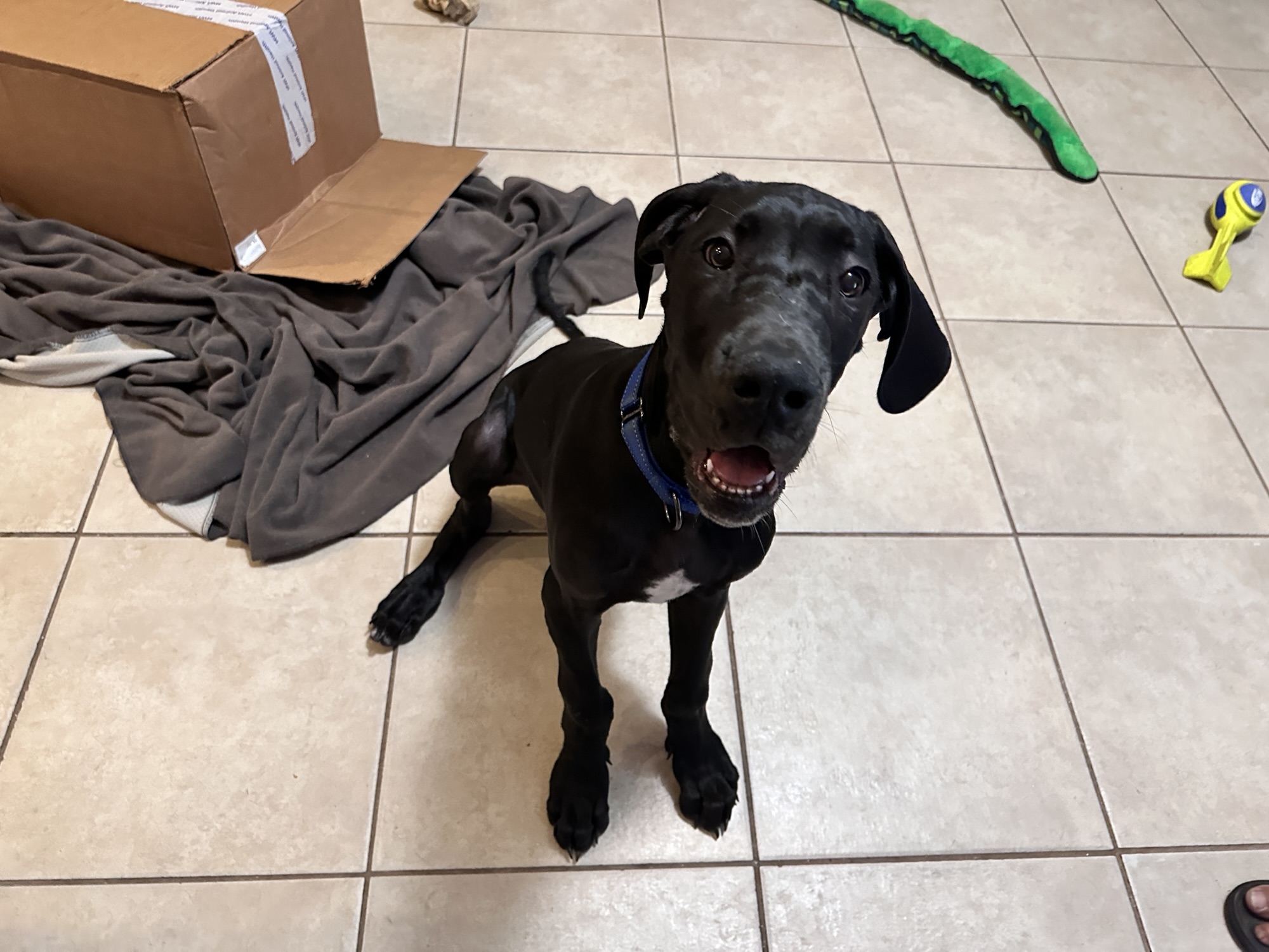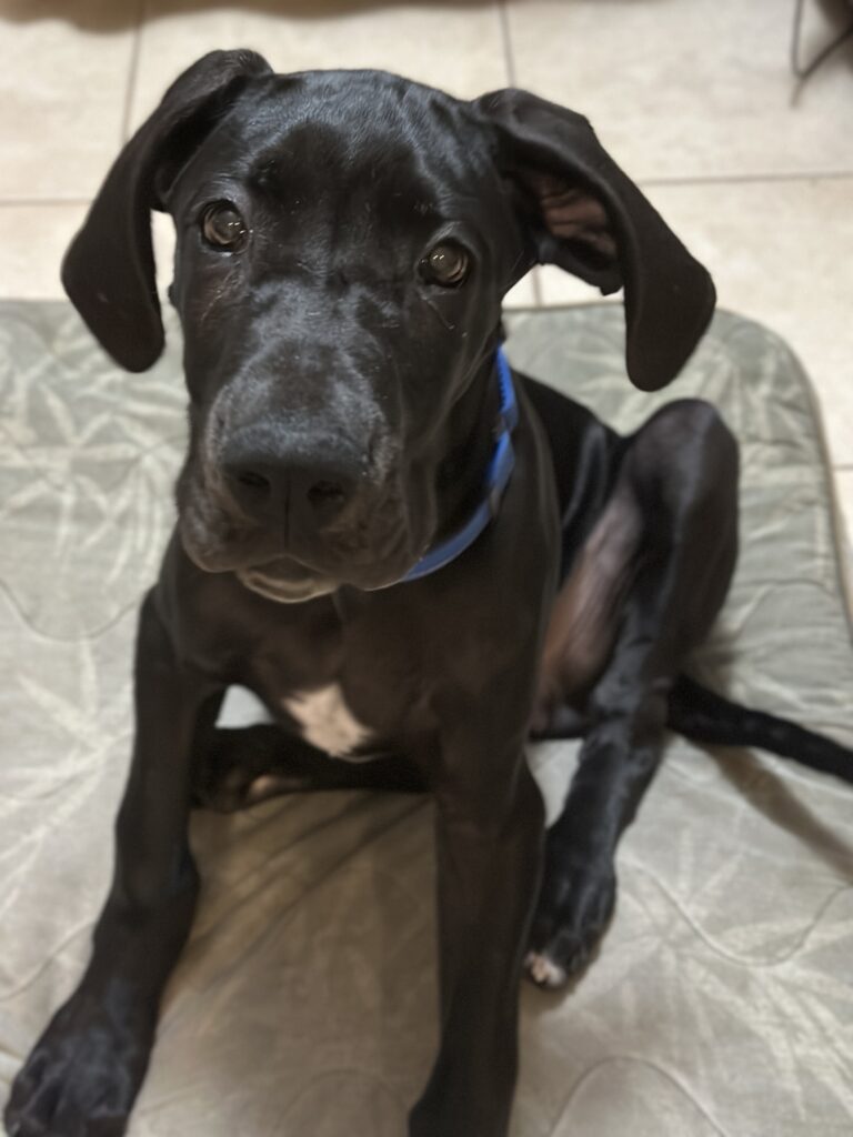 He’s still learning his manners and can be a bit mouthy, so a dane-savvy family without very small children is currently the best fit for him. As potty training is still a work in progress, a household with someone generally home to tackle that is preferred.
