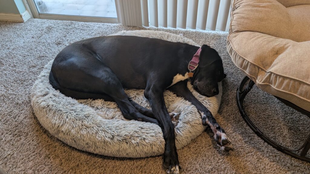 She can be playful when the mood strikes and has a special fondness for plush toys and balls. Fetch and tug are favorites and she’s always up for a little fun before stretching out for a nap.